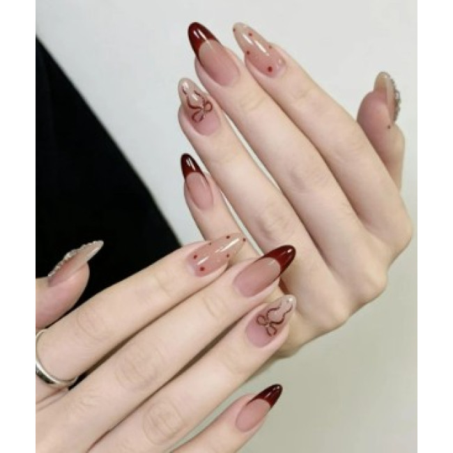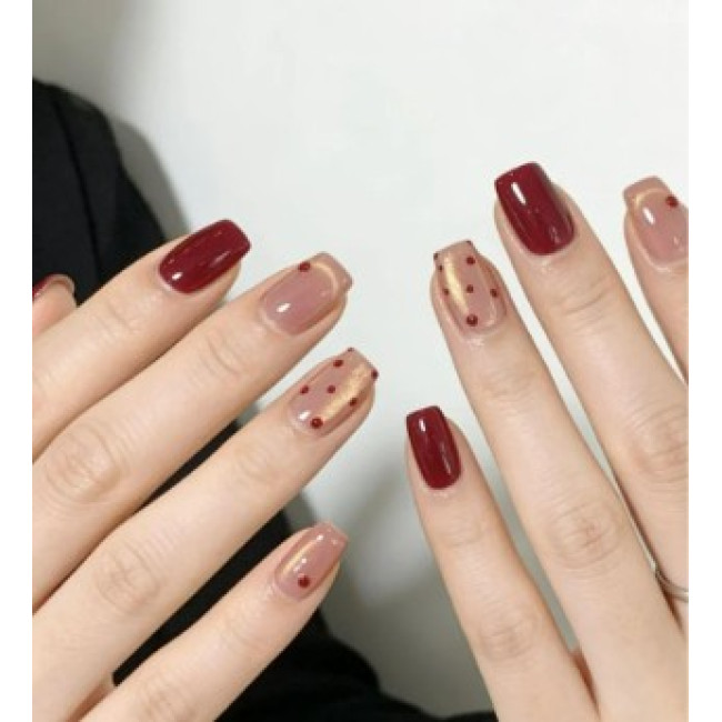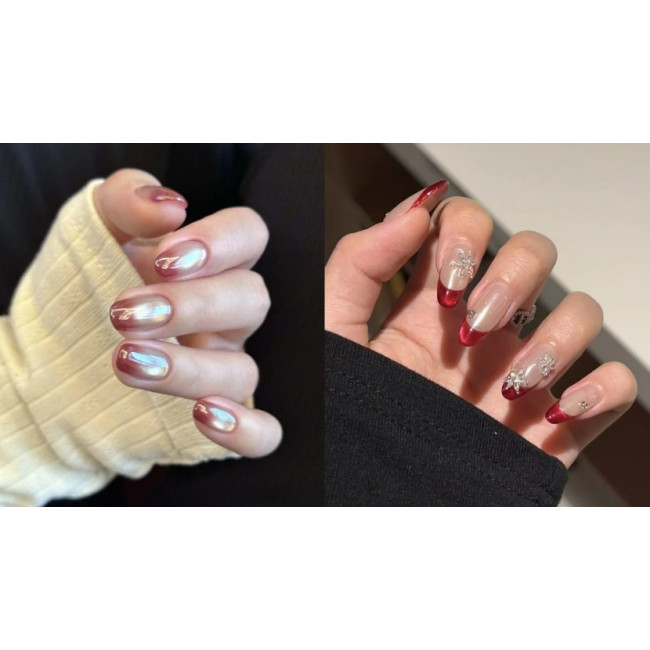 酒紅色介於紅與紫之間,色調更深、更沈穩,自帶一種成熟的大人感。相較亮紅,酒紅色存在感強卻不張揚,特別適合短甲或圓甲型,整體氣場剛剛好,很適合過年聚會或較正式的場合。